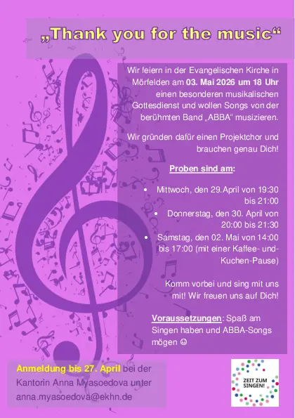 Am 3.5. gibt es einen Gottesdienst mit Liedern von Abba, wer möchte kann da gerne mitsingen.
