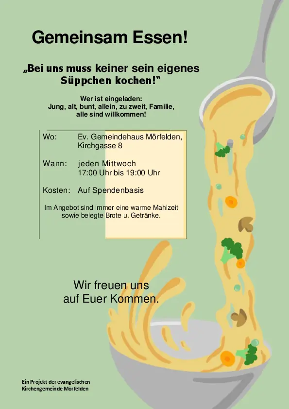 Jeder ist dazu eingeladen vorbeizukommen und in Gesellschaft ein leckeres Essen zu sich zu nehmen. Es geht auf Spendenbasis. Es gibt wechselnde Kochteams die ehrenamtlich ein leckeres Menü zusammenstellen, belegte Brote herrichten und die Tisch dekorieren.